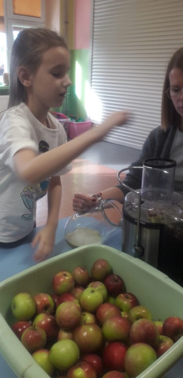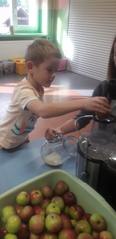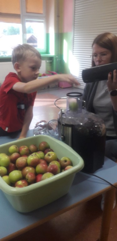 Dzięki uprzejmości jednego z rodziców otrzymaliśmy pyszne, soczyste jabłka, z których dzieci samodzielnie przygotowały świeżo wyciskany sok. Degustacja była prawdziwą przyjemnością! Przedszkolaki poznały jabłko za pomocą wszystkich zmysłów – dotykały, wąchały, smakowały, a nawet słuchały, jak chrupie podczas gryzienia.