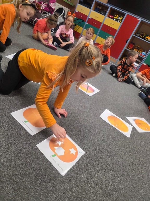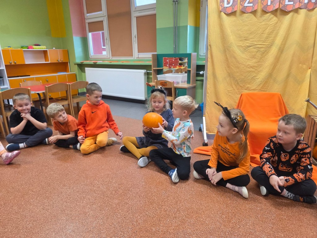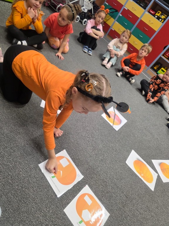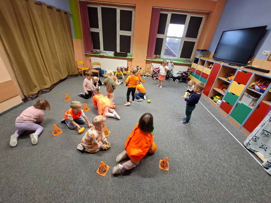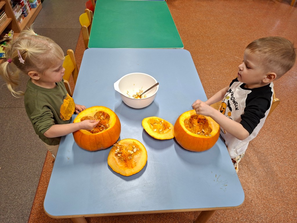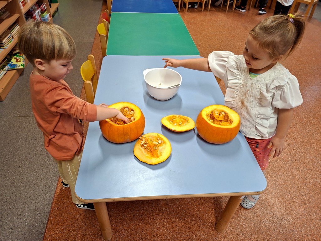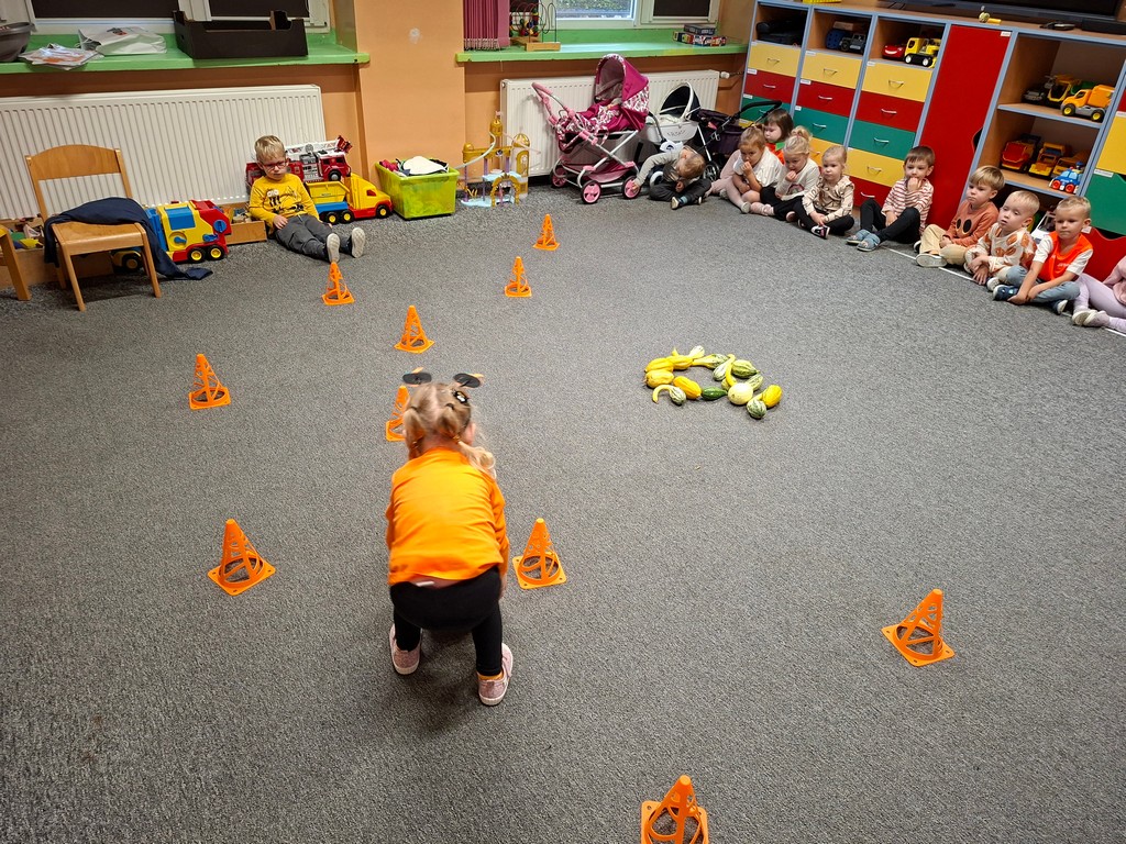 Podczas zajęć przedszkolaki mogły zobaczyć, jak wygląda dynia w środku, dotknąć jej miąższu i pestek, a także porozmawiać o tym, do czego można ją wykorzystać w kuchni i zabawie. Nie zabrakło również zabaw ruchowych z dynią w roli głównej – dzieci toczyły ją, przenosiły, a nawet urządzały dyniowe wyścigi.