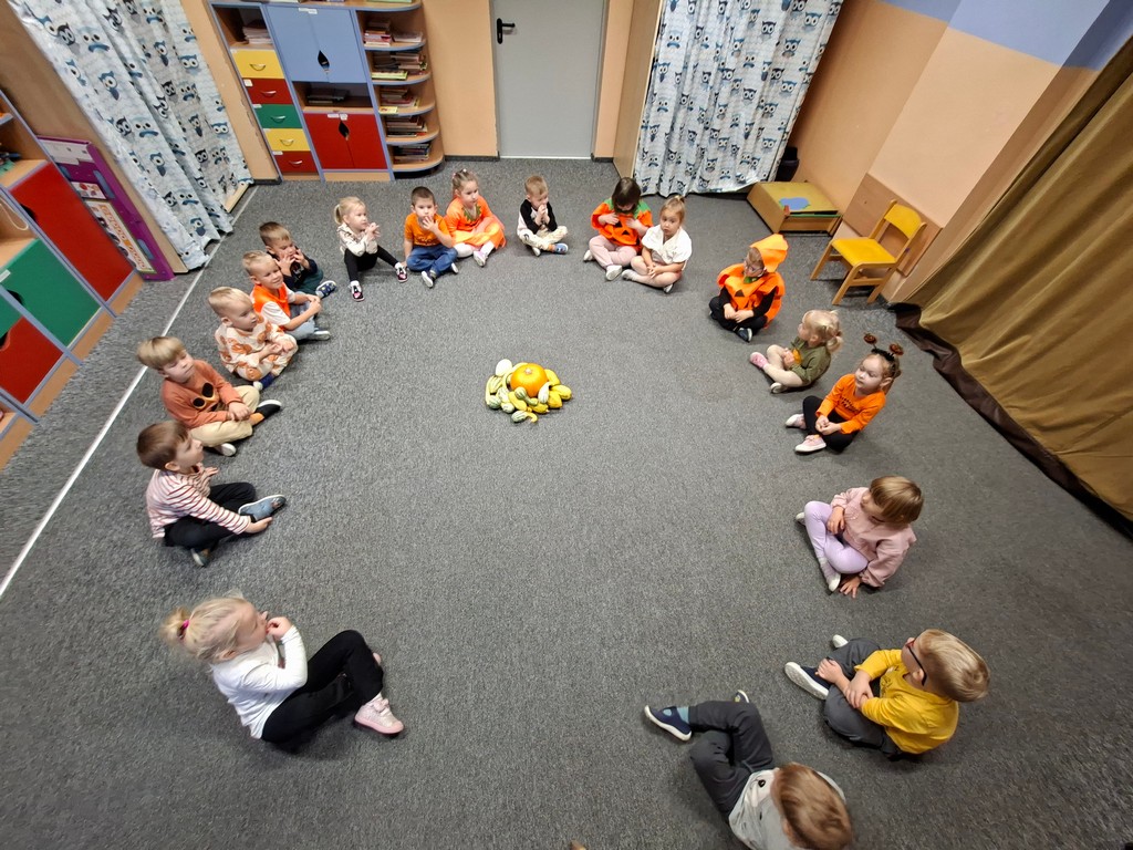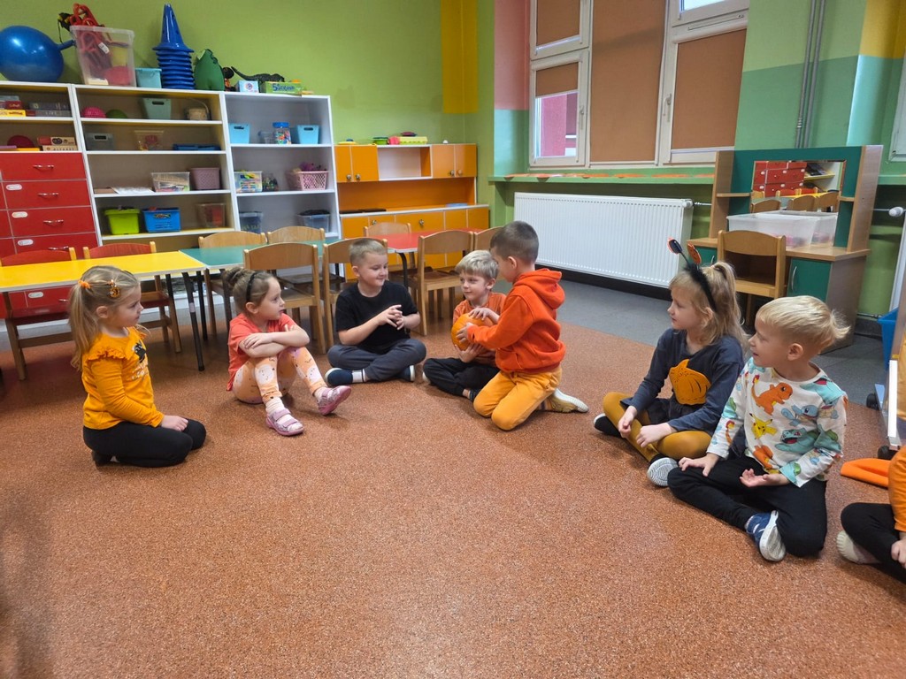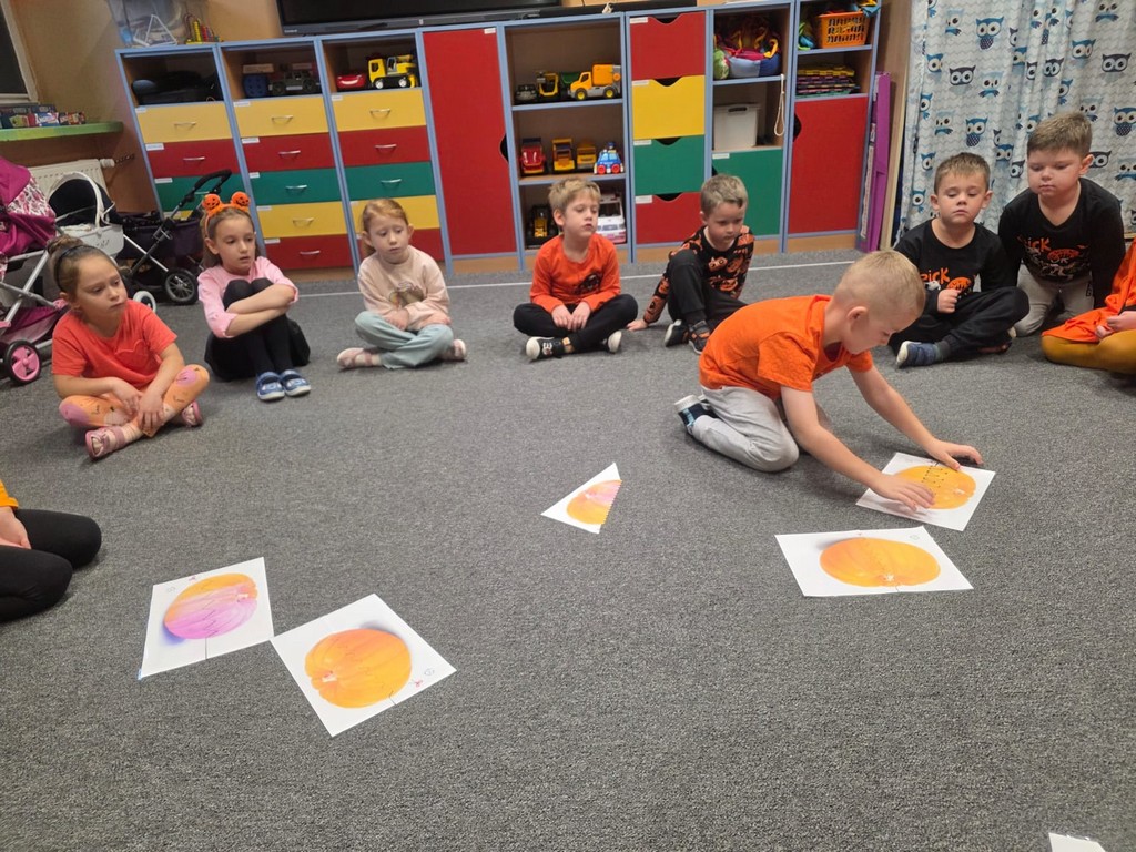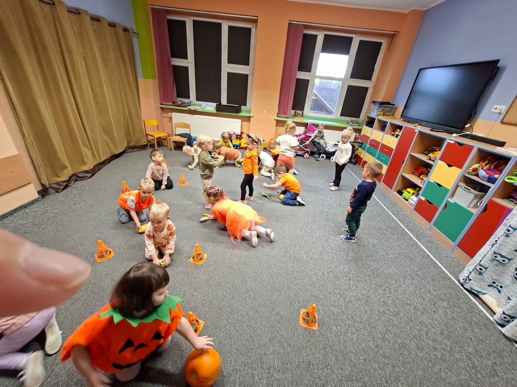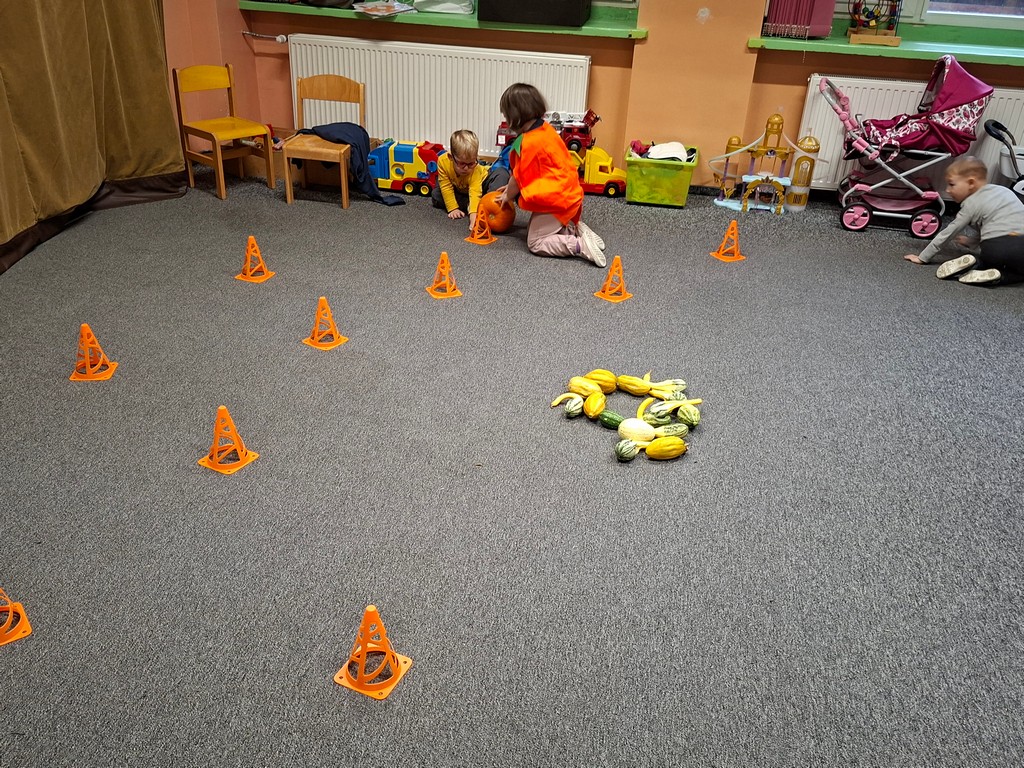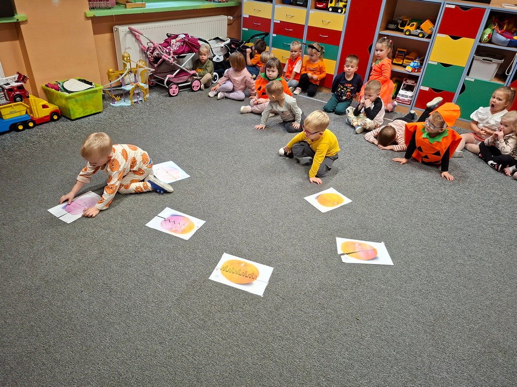Podczas zajęć przedszkolaki mogły zobaczyć, jak wygląda dynia w środku, dotknąć jej miąższu i pestek, a także porozmawiać o tym, do czego można ją wykorzystać w kuchni i zabawie. Nie zabrakło również zabaw ruchowych z dynią w roli głównej – dzieci toczyły ją, przenosiły, a nawet urządzały dyniowe wyścigi.