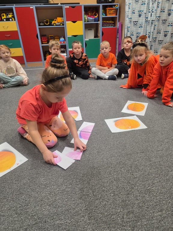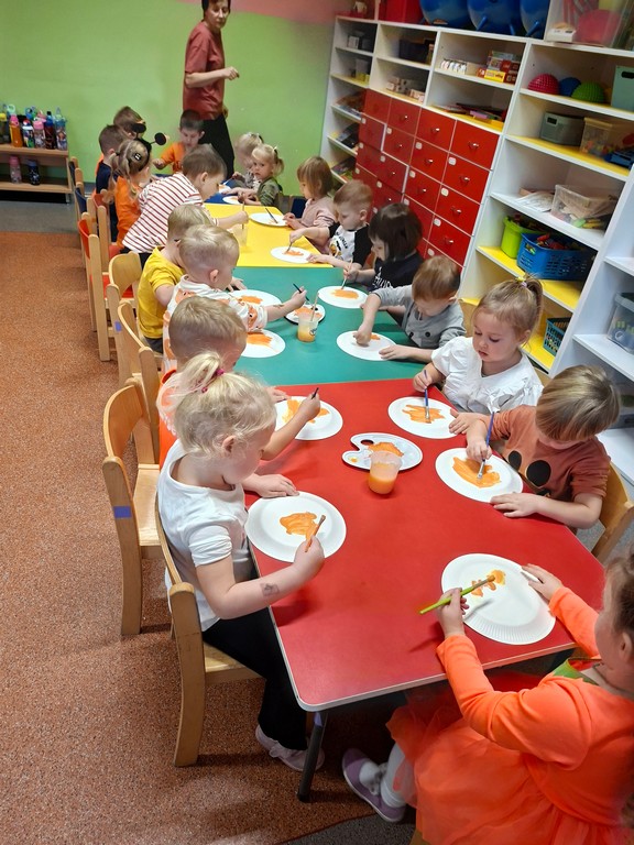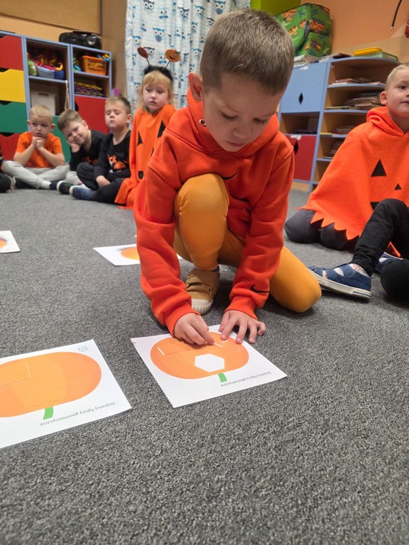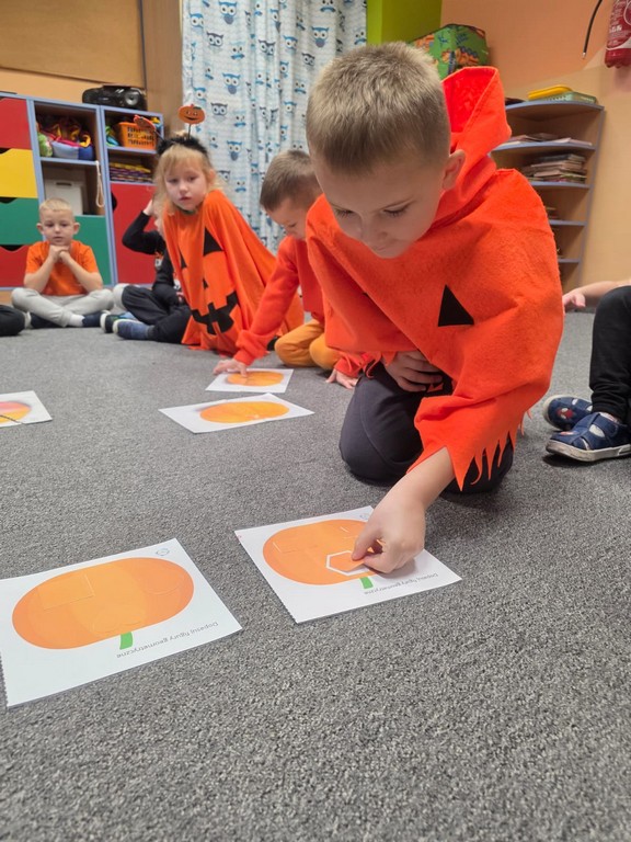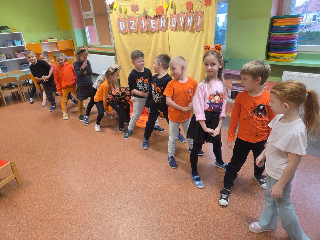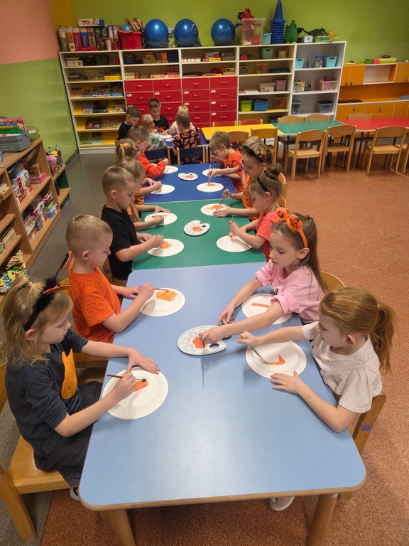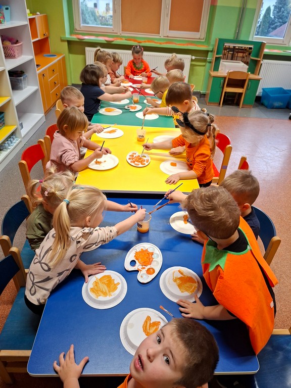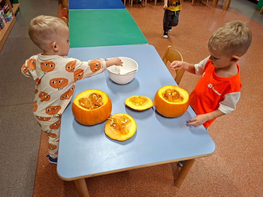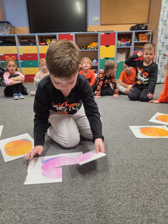 Podczas zajęć przedszkolaki mogły zobaczyć, jak wygląda dynia w środku, dotknąć jej miąższu i pestek, a także porozmawiać o tym, do czego można ją wykorzystać w kuchni i zabawie. Nie zabrakło również zabaw ruchowych z dynią w roli głównej – dzieci toczyły ją, przenosiły, a nawet urządzały dyniowe wyścigi.