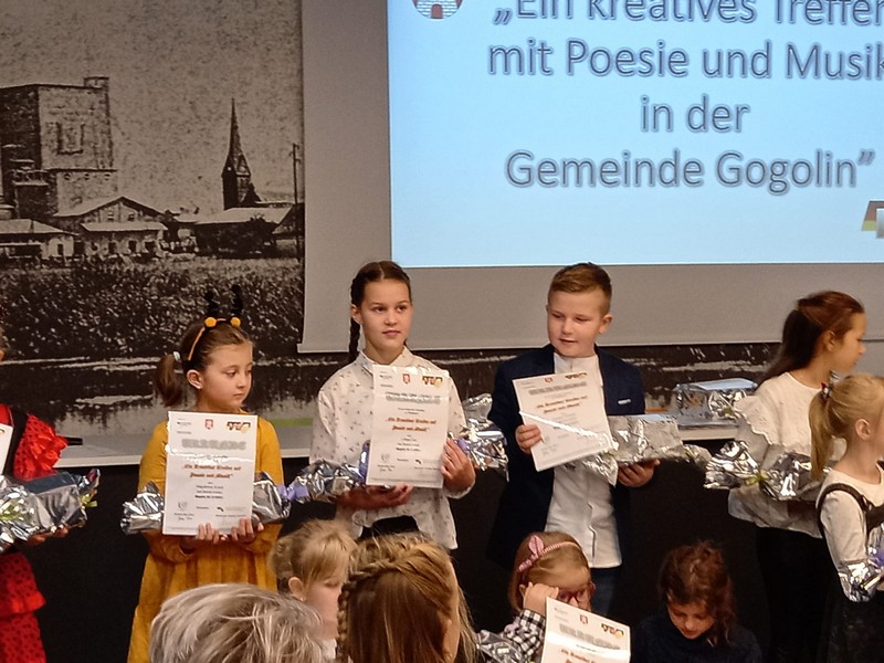 26.10.2021 roku odbył się w Miejskiej Bibliotece Publicznej konkurs z języka niemieckiego „Ein kreatives Treffen mit Poesie und Musik in der Gemeinde Gogolin”. Uczestnikami byli uczniowie klas młodszych oraz przedszkoli. Naszą szkołę reprezentowali: klasę I - Magdalena Kurek, klasę II – Liliana Guz a klasę III- Tomasz Gebauer. Magda zaśpiewała piosenkę pt. „Guck mal diese Biene da”, Liliana piosenkę „La Cucaracha”, natomiast Tomek piosenkę „Die Jahreszeiten”. Wszyscy uczniowie wrócili bardzo zadowoleni z powodu otrzymanych dyplomów i nagród.