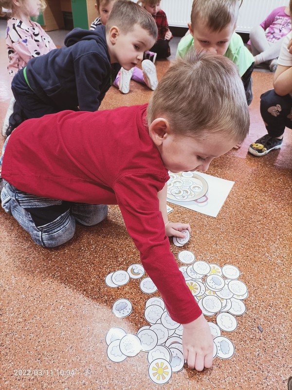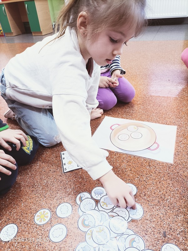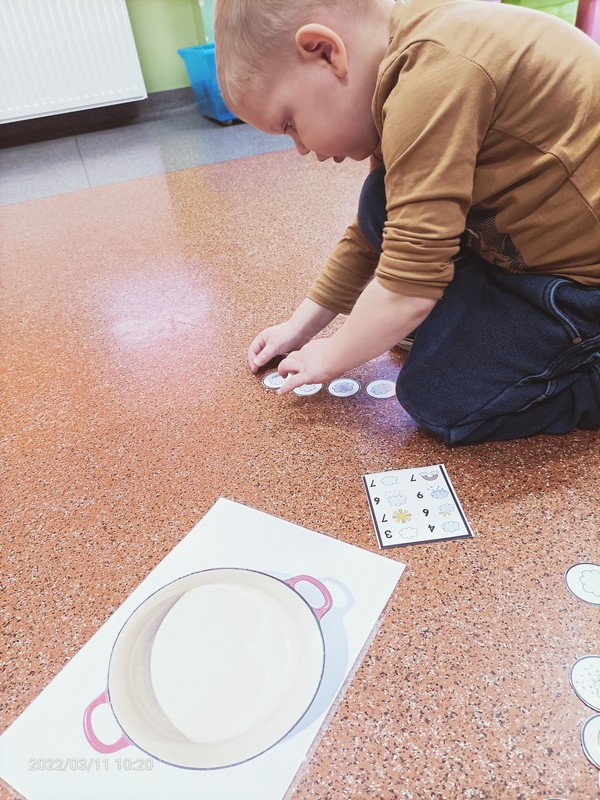 Przedszkolaki również miały swój garnek, w którym mieszały różne rodzaje opadów atmosferycznych. To doskonała zabawa matematyczna, która wspomaga w nauce liczenia oraz utrwaleniu już poznanych wcześniej wiadomości.