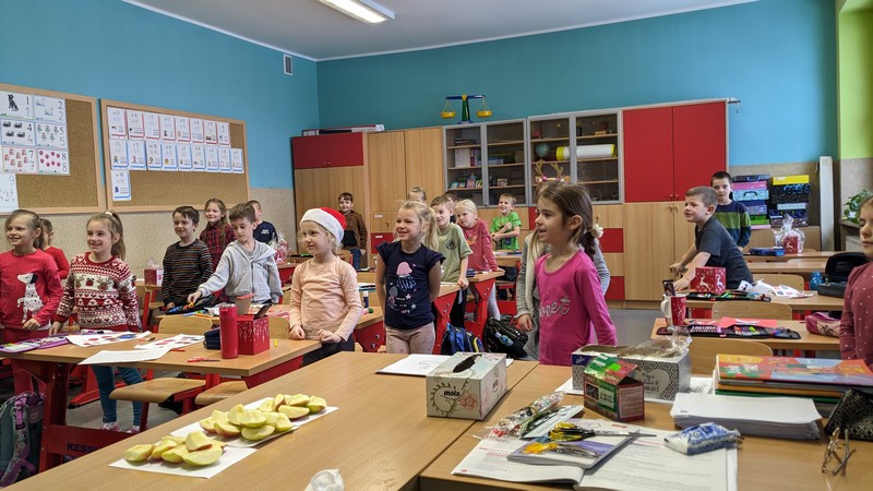 6 grudnia uczniów naszej szkoły odwiedził Święty Mikołaj. Spotkał się z każdą klasą i w zamian za piosenkę lub wierszyk obdarował dzieci słodkimi prezentami. Nikt nie otrzymał rózgi, a to oznacza, że w naszej szkole uczą się same grzeczne dzieci :)